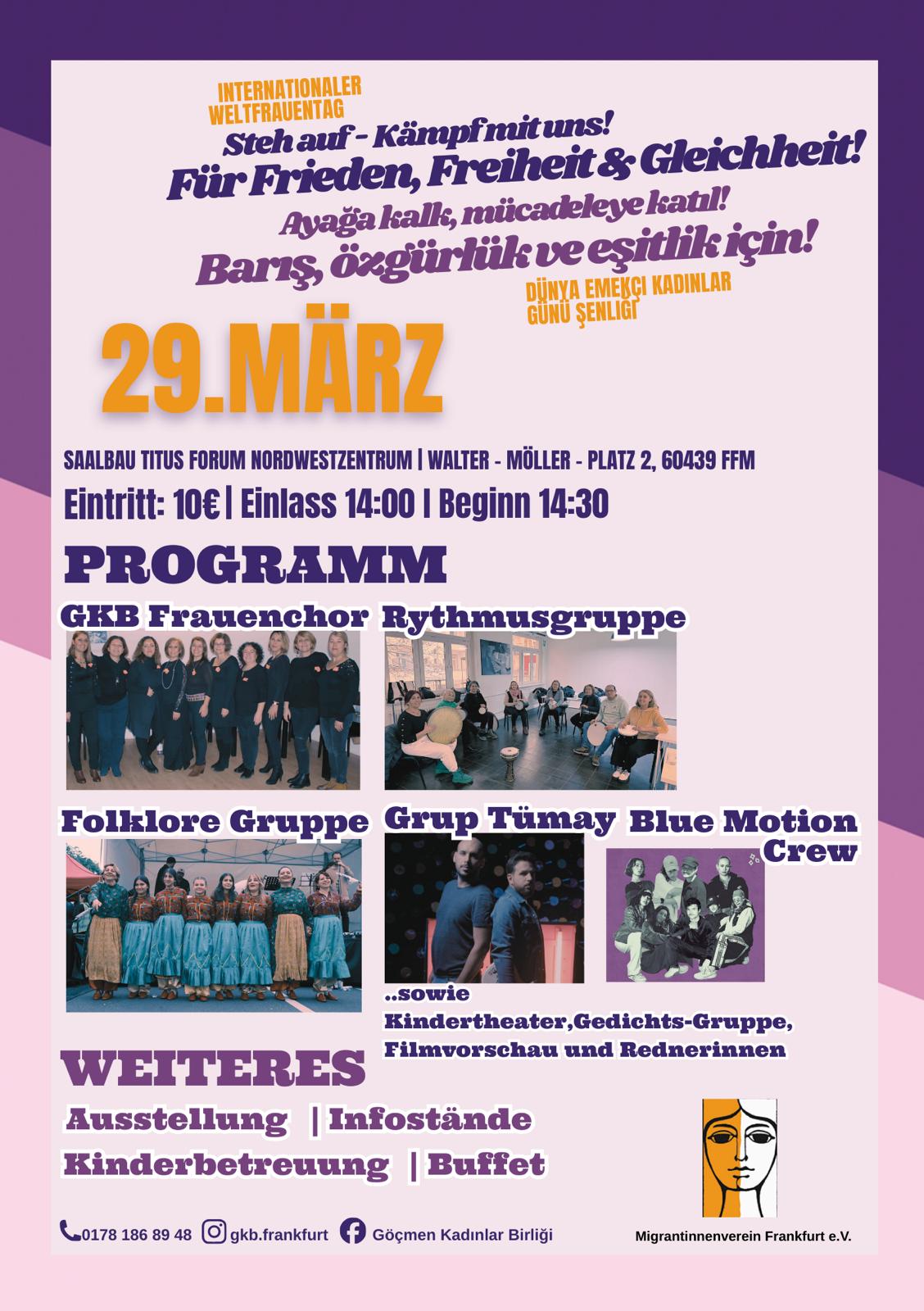 Göçmen Kadınlar Birliği (GKB Frankfurt) ve Göçme Kadınlar Derneği (Migrantinnenverein Frankfurt e.V.) tarafından organize edilen şenlik, kadınların barış, özgürlük ve eşitlik mücadelesini büyütmeyi, dayanışmayı güçlendirmeyi ve toplumsal farkındalığı artırmayı hedefliyor.