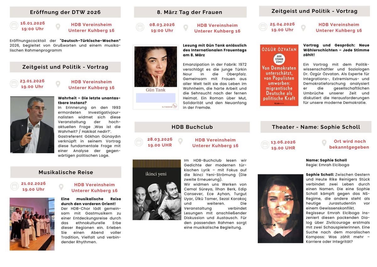 Almanya’daki Sosyal Demokrat Halk Dernekleri Federasyonu HDF çatısı altında faaliyet yürüten Halk Dernekleri Birimi (HDB) Ulm/Neu-Ulm’un düzenlediği programın, zamanı yalnızca doldurmakla kalmayacağı, ona özel bir anlam, derinlik ve tartışma katmayı hedeflediği belirtiliyor.