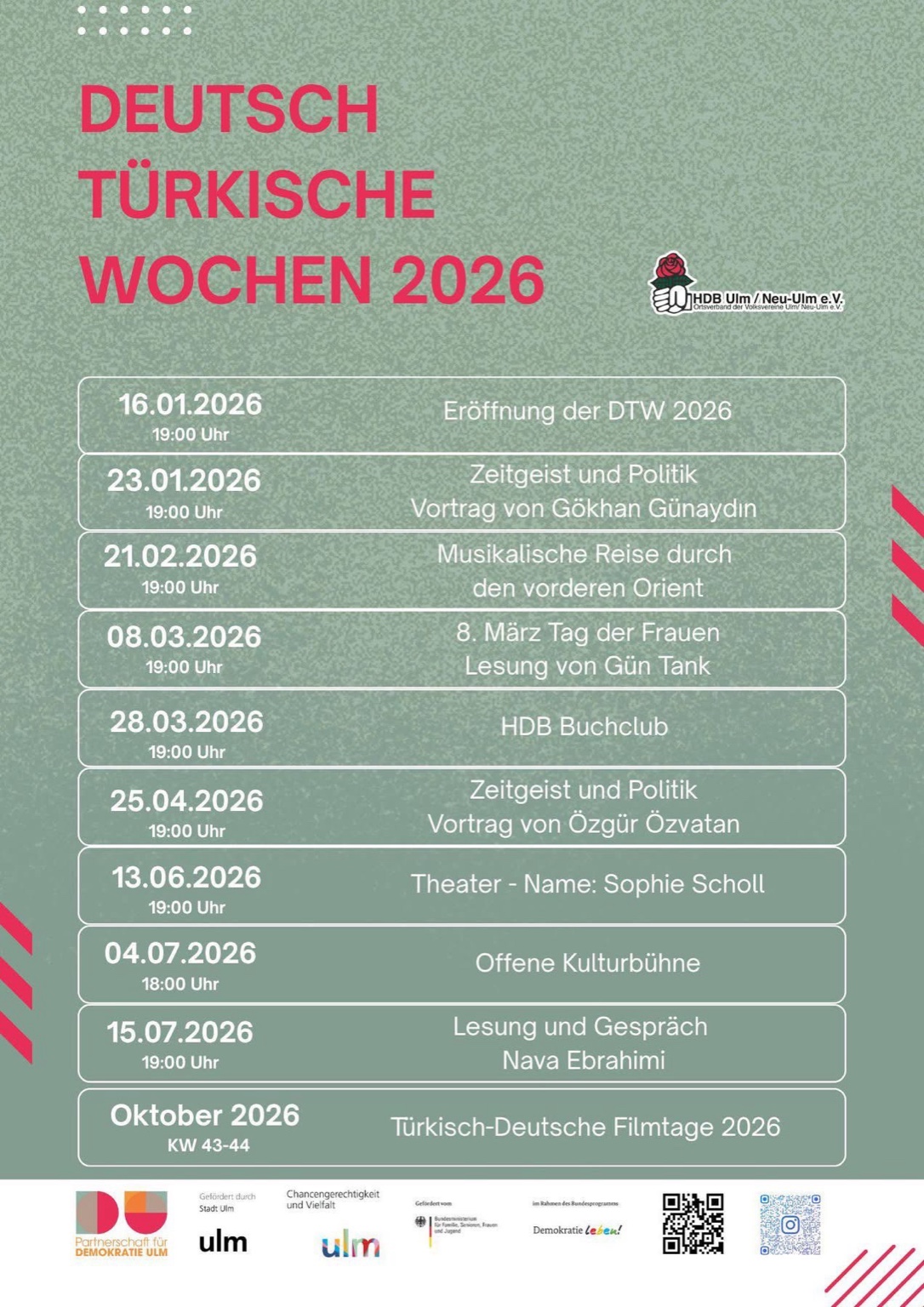 Türk – Alman Haftaları, Ulm Belediyesi, Demokrasi için Ortaklık Programı ve Federal Aile, Yaşlılar, Kadınlar ve Gençlik Bakanlığı’nın desteğiyle gerçekleşiyor.